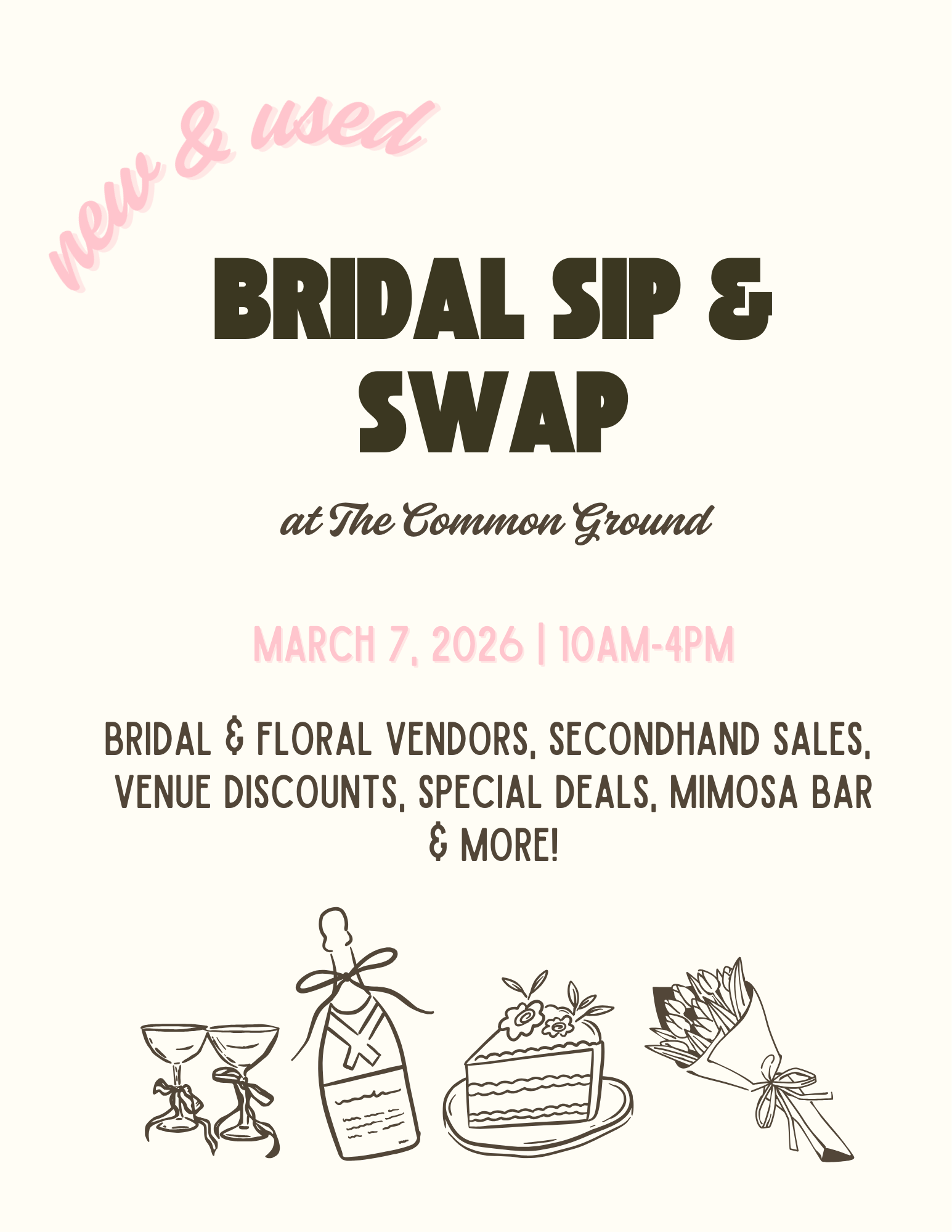 Join us for our third annual Bridal Sip and Swap! Shop through newly married brides selling their gently used decor, dresses and accessories, you name it!